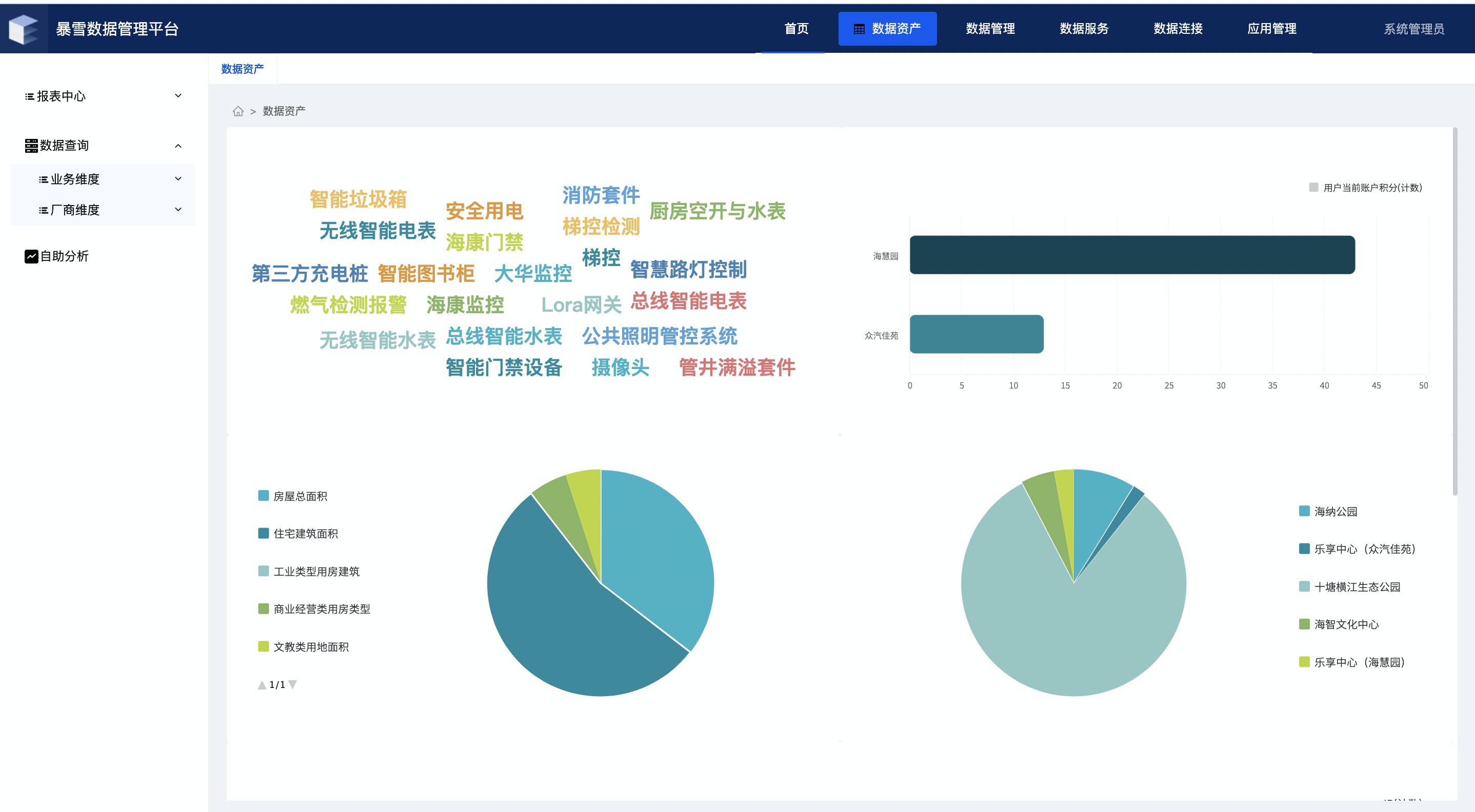 全面打通企业数据,构建数据资产平台,可以在一个平台上查看,使用各个系统的数据,实 现企业的数据的一体化管理,同时具备业务用户自助查询,分析,查看等功能,能够极大释放 企业数据的应用价值和场景。